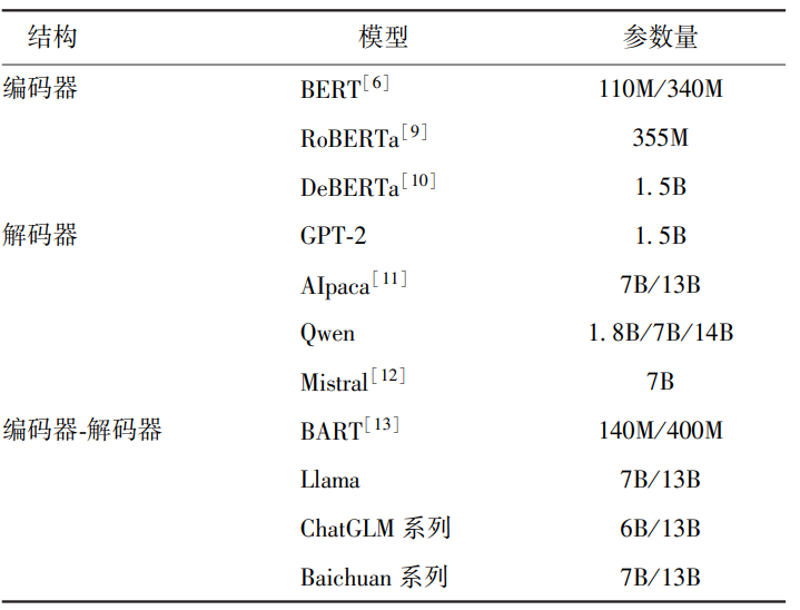 LLMs的技术路线主要包括三种,即基于解码器的ChatGPT系列[5]、基于编码器的BERT系列[6]和基于编码器-解码器的Llama系列[7]和ChatGLM系列[8]。据此分类方法可将开源的通用LLMs进行分类,结果如表1所示。
