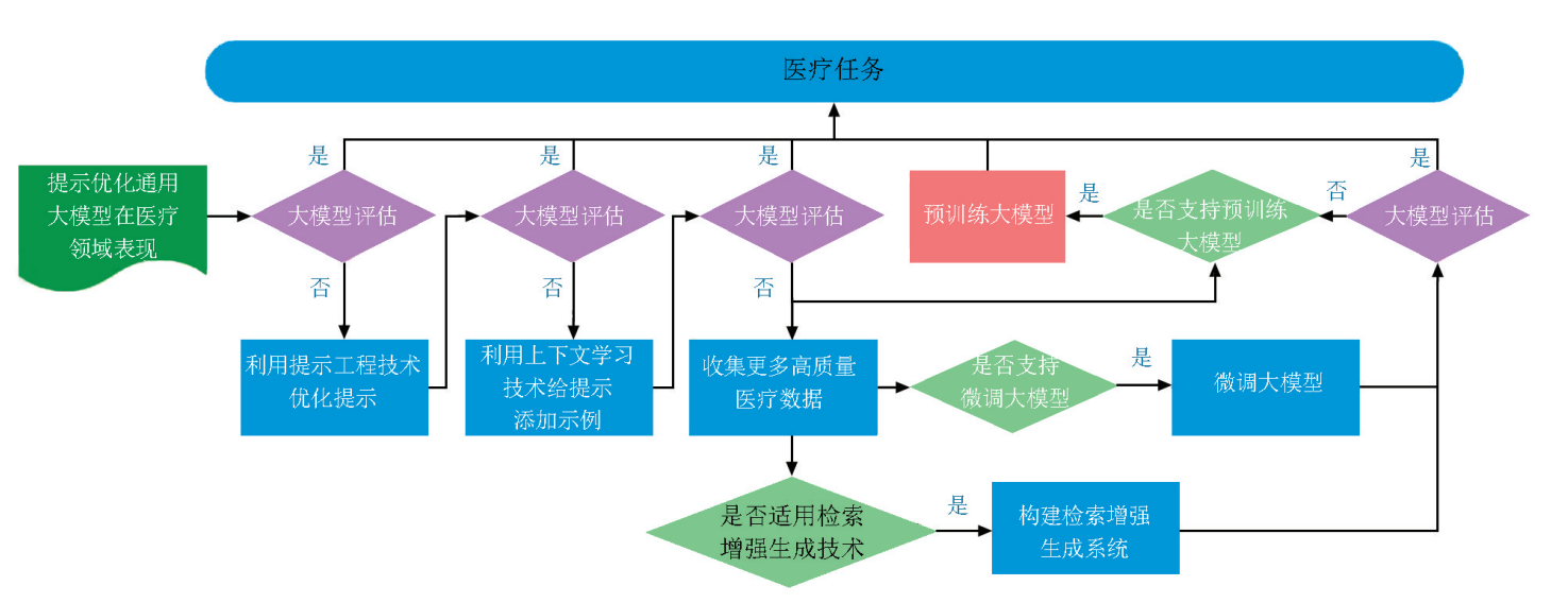 在通用LLMs的基础上应用领域适应技术再训练即可得到医学LLMs,目前主流的领域适应技术主要有预训练(pre-training)、微调(fine-tuning),或直接通过检索增强生成(RAG)技术和上下文学习(ICL)技术将通用 LLMs 与医学领域对齐而实现[14]。笔者结合此四种方法介绍从通用LLMs到医学 LLMs 的实现原理,并总结医疗领域LLMs的最佳实践流程。