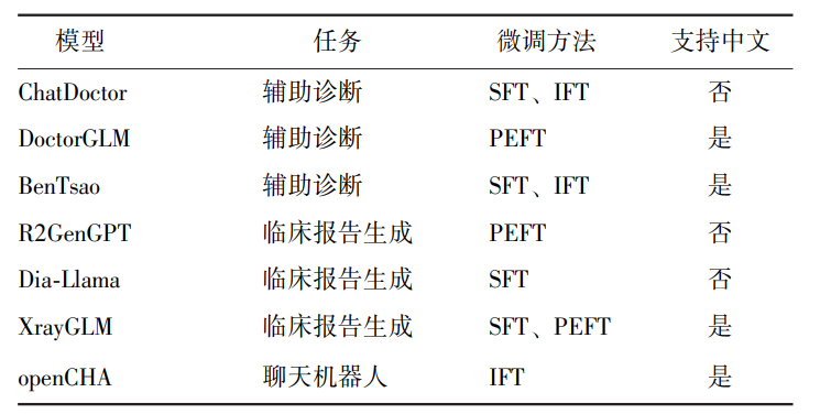 目前的微调方法包括监督微调(SFT)、指令微调(IFT)和参数高效微调(PEFT)。其中SFT支持在不同类型的医学语料库上对通用LLMs进行微调,其对语料库的结构无特殊要求,既支持多轮的医患对话[23]、单轮的医学问题解答[21],也支持知识图谱[24],并根据训练语料的不同获得功能多样的医学LLMs。