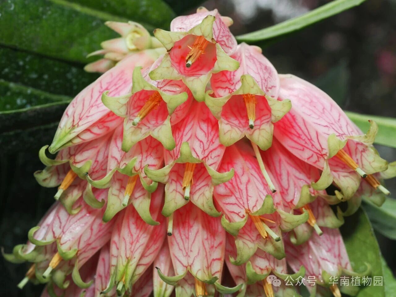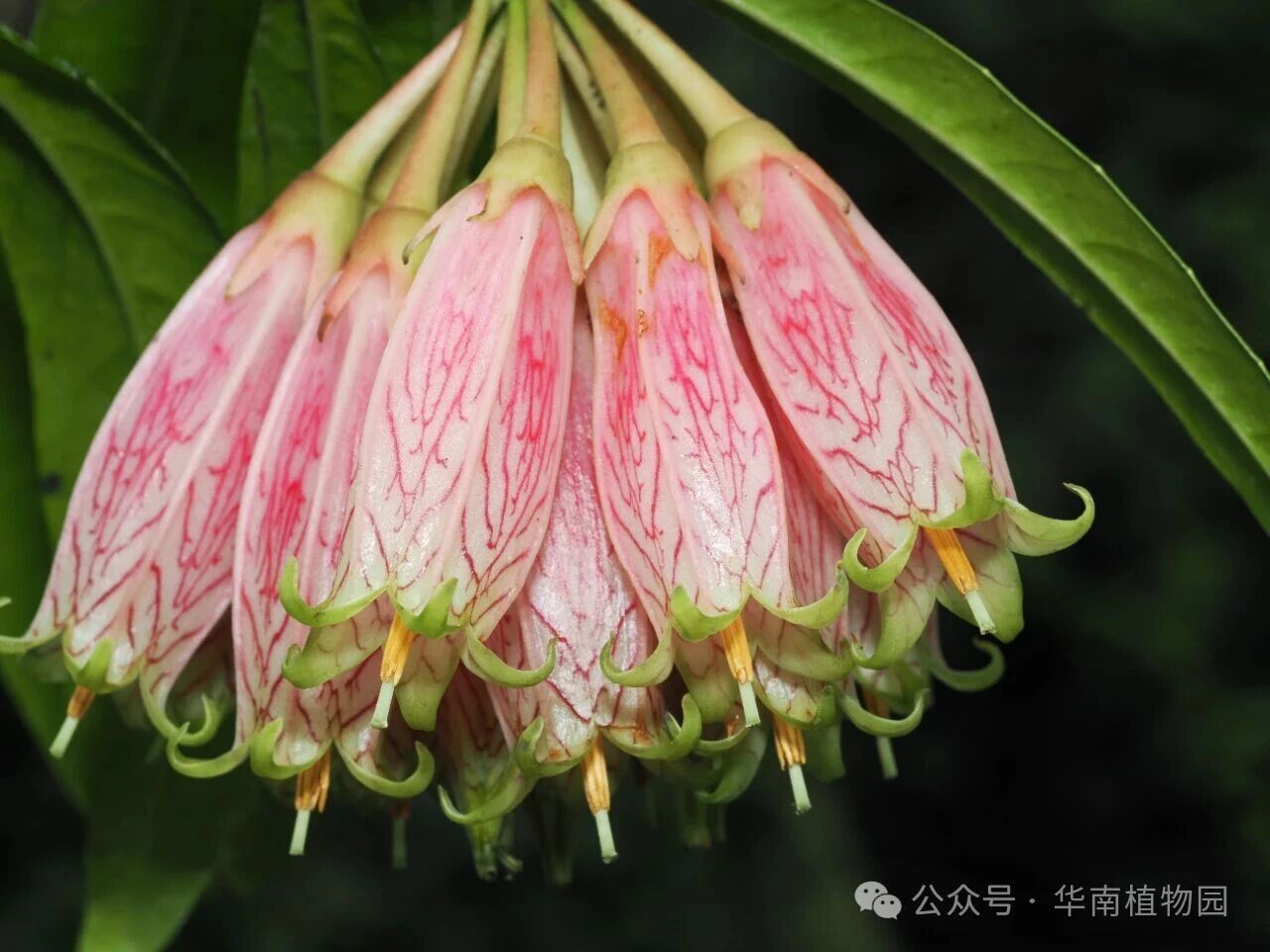 如果说粗犷的块根代表了它生存的坚韧,那么它的花朵则展现了其极致的秀美。缅甸树萝卜通常丛枝上垂下总状花序,绽放3-10朵长筒状的花朵。花冠长达4.5-6厘米,呈迷人的玫瑰红色或淡红色,表面还点缀着暗紫色或紫红色的V形曲折横纹。花冠的顶端,五个狭三角形的裂片呈清新的淡绿色,微微向外平展并卷起,像极了精致的小裙子,又像一串随风摇曳的红色小灯笼。这样奇特的花型并非为了取悦人类,而是与它的传粉者——太阳鸟完美契合。长长的花冠筒将甘甜的花蜜深藏底部,只有像太阳鸟这样拥有修长而弯曲喙的鸟类,才能将喙伸入花筒,吸食花蜜,并在这个过程中顺便为花朵传授花粉。