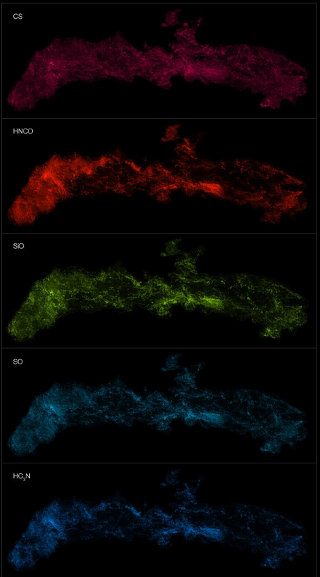 ALMA 观测到的银河系中心不同分子分布:ACES 已绘制出银河系中心数十种分子的空间分布。此处展示的五种分子自上而下分别为:一硫化碳、异氰酸、 一氧化硅、一氧化硫和氰乙炔。(图片来源:ALMA(ESO/NAOJ/NRAO)/ S. Longmore 等)