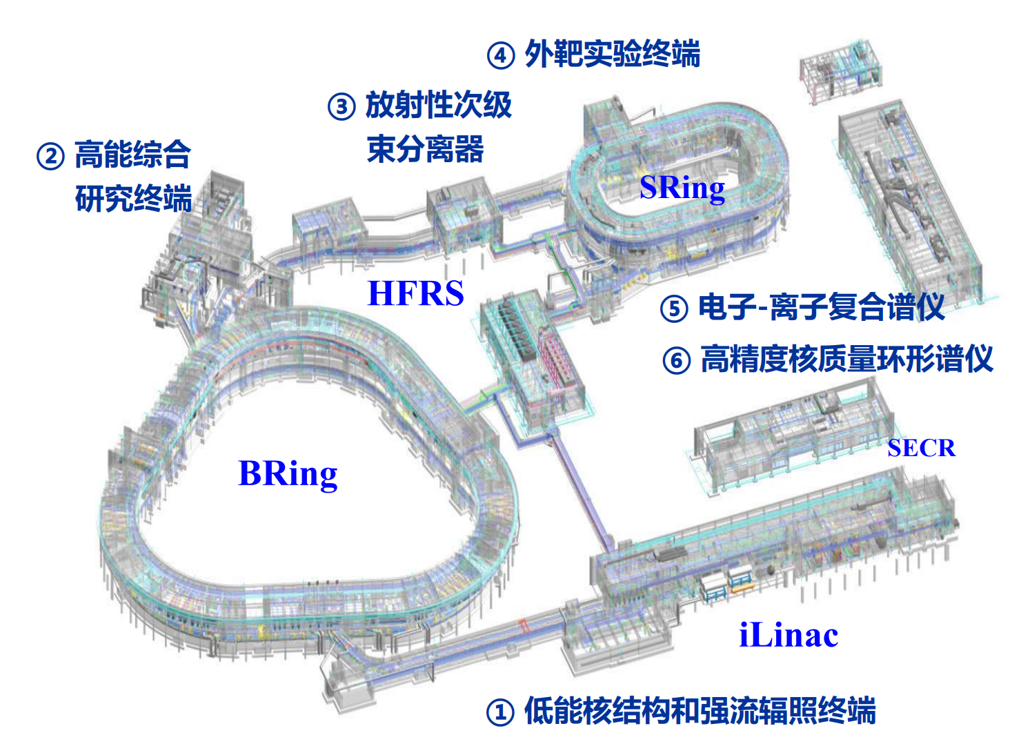 获得足够能量的重离子再根据需要被送入到不同的研究终端去做各种各样的实验。这里有评价先进核能材料抗辐照性能的强流离子束辐照终端,有可以合成新元素和新核素的充气反冲谱仪终端,还有高能核物理研究的高能综合研究平台,包括用于研究核物质相结构、QCD相变与临界点的核物质相结构终端,用于研究超核性质、扩展超核存在版图的超核终端等等,以及还有能够精确测量原子核质量和寿命的高精度环形谱仪等等。