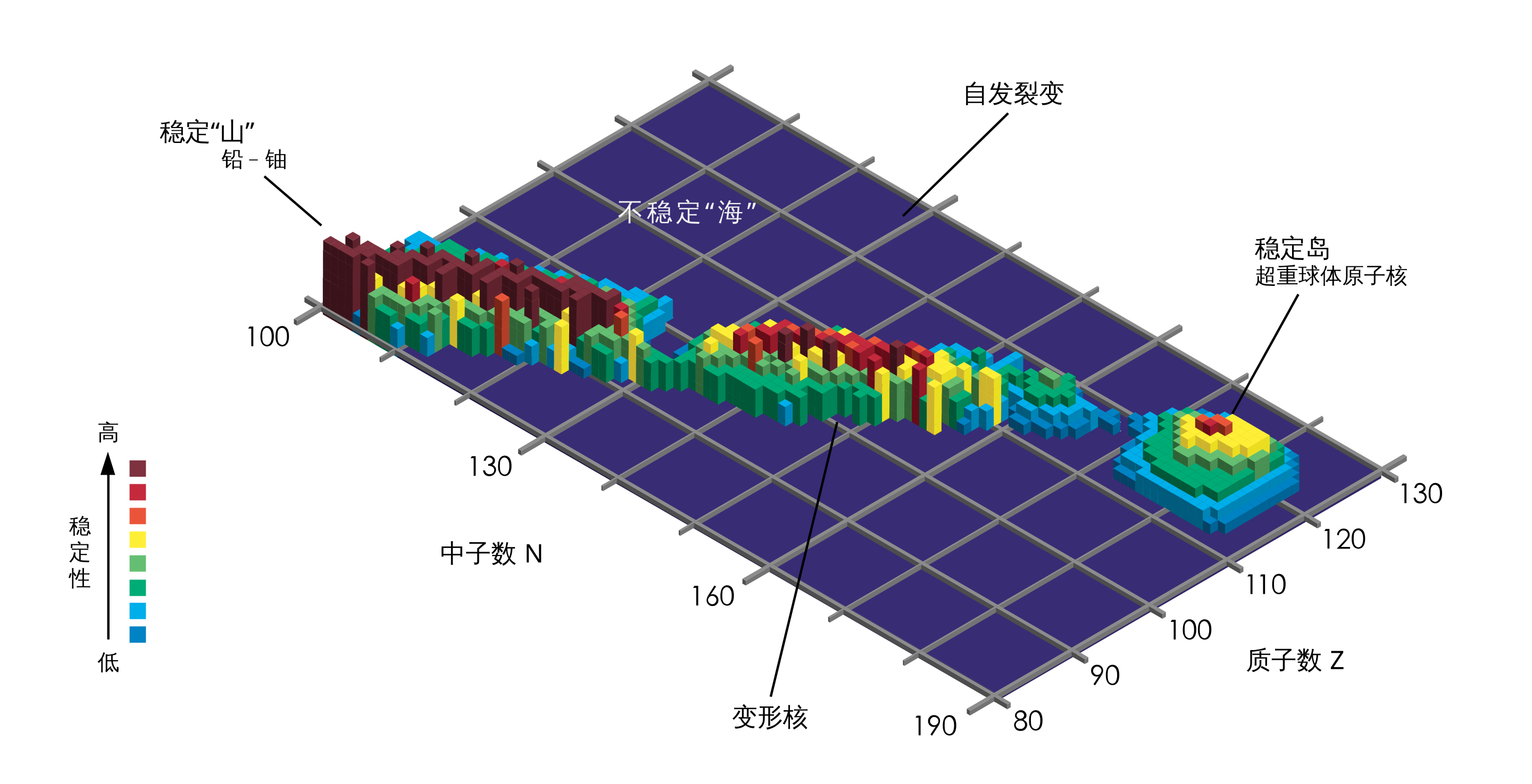 稳定岛三维示意图。中子数N和质子数Z不同的原子核,稳定性也不同。科学家预测,在质量很大的原子核区域,或许存在一个稳定的区间。
