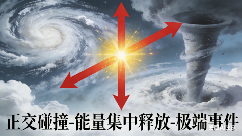 如果说物理分解是“拆解混沌”的工具,那么正交碰撞理论便是“解读极端”现象的关键钥匙。当我们通过物理分解从混沌系统中分离出扰动态后,会发现所有极端事件——无论是大气中的龙卷、海洋中的海啸,还是太阳上的黑子爆发、银河系中的黑洞活动,甚至是人体中的癌症病变——本质上都是扰动能量集中释放的结果。而这种能量的集中,往往源于不同扰动量的相互作用,其中最剧烈的能量释放,便来自“正交碰撞”:当两个扰动矢量力垂直相交时,会在碰撞点形成最大能量密度,这种能量的爆发会直接摧毁系统的正常态平衡,引发极端事件 [4]。即便碰撞角度并非严格90度(如30度),其能量密度也能通过定量计算确定(为正交碰撞能量密度的一半),这为极端事件的强度预判提供了精准的量化依据。