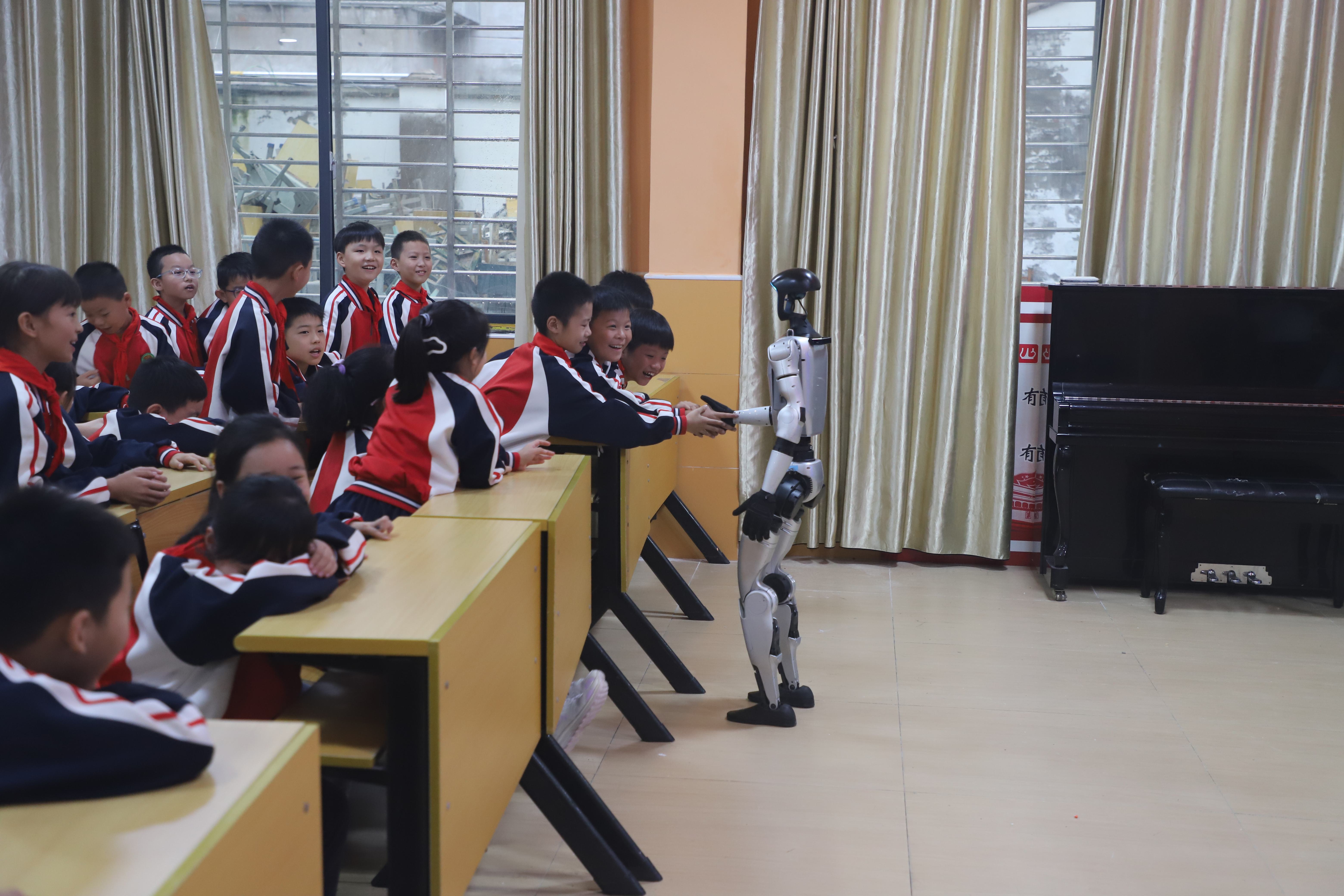 最令人兴奋的环节当属互动时刻——机器人缓缓走向学生队伍,挥动手臂向大家问好。“机器人你好!”孩子们纷纷举手回应,笑声与欢呼此起彼伏。随后,机器人还与孩子们进行了温暖的拥抱互动,将现场气氛推向高潮。