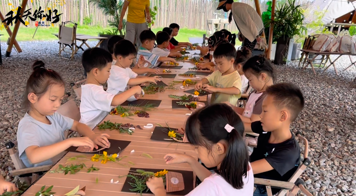 《拾秋》自然实践课上,孩子们走进大自然,拾起秋天的花草、落叶,一起感受秋天的多彩。然后学生们把落叶、花草装进自己的小花篮,希望用这种方式留住秋天,留住大自然的美丽。