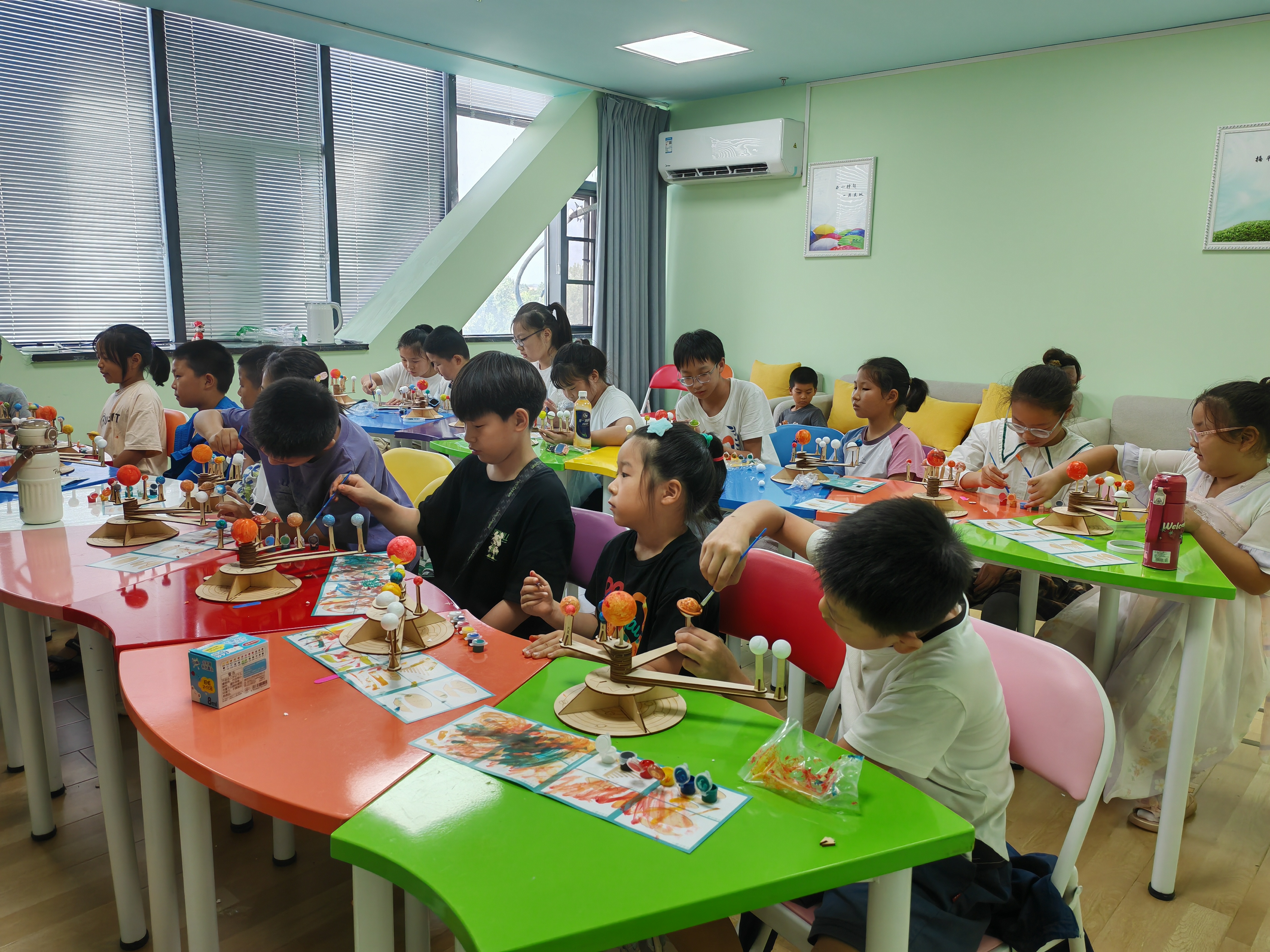 随后,科普志愿者带领孩子们动手组装九球仪模型。孩子们小心翼翼地将泡沫球固定在轨道支架上,用彩笔为每颗星球赋予个性色彩——火红的火星、蓝绿相间的地球、金黄色的土星环。最精彩的环节莫过于成果展示,孩子们捧着亲手制作的九球仪,向镜头介绍自己的“宇宙”,“我的太阳是红红的,因为它很热”,“我的地球有大片蓝色,因为地球上有很多海洋”。这些带着童真创意的九球仪,不仅是孩子们亲手完成的作品,更让他们对宇宙的认知从书本走向了现实。
