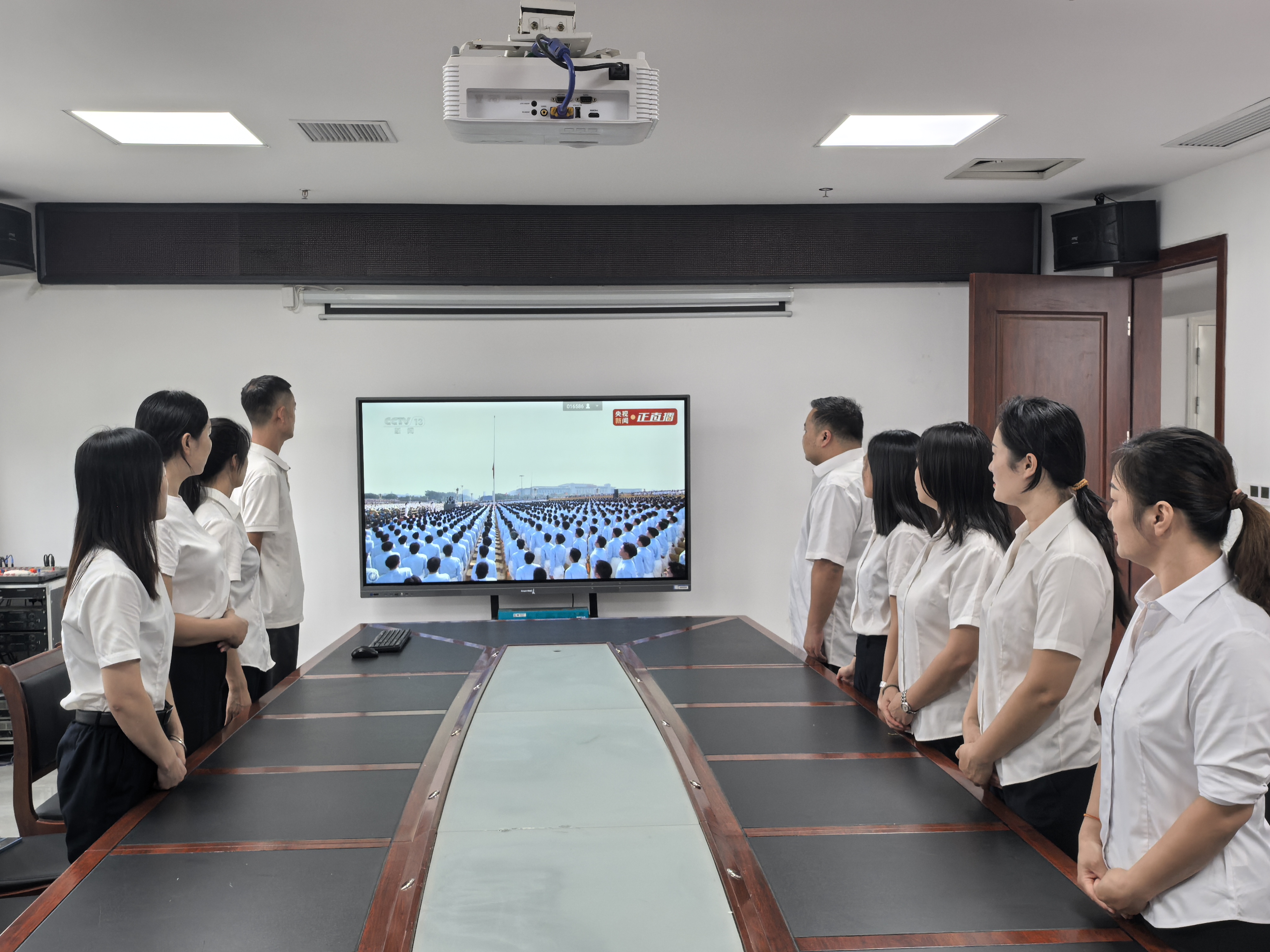 上午9时,全体党员干部整齐列座,通过电视直播同步观看阅兵仪式。威武的军队方阵、先进的武器装备、昂扬的士气风貌,生动展现了国家综合实力和国防现代化建设成就。